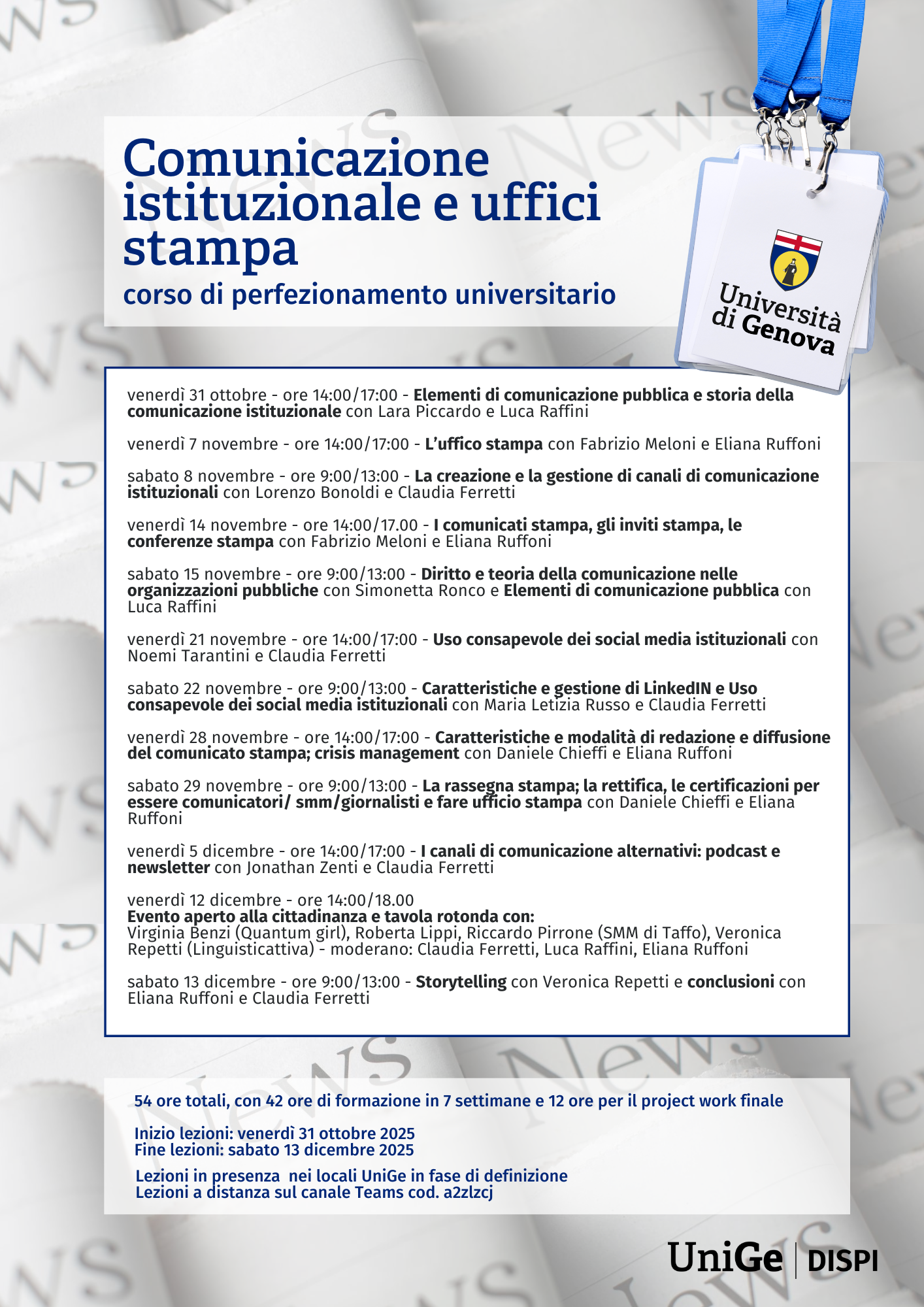 Il DiSPI ha attivato, per l'a.a. 2025-2026, il corso di perfezionamento universitario in “Comunicazione istituzionale e uffici stampa”, pensato per fornire competenze sul ruolo del comunicatore istituzionale, con particolare riferimento alla progettazione, allo sviluppo e all’organizzazione degli uffici stampa e alla gestione dei social media in enti pubblici e aziende.